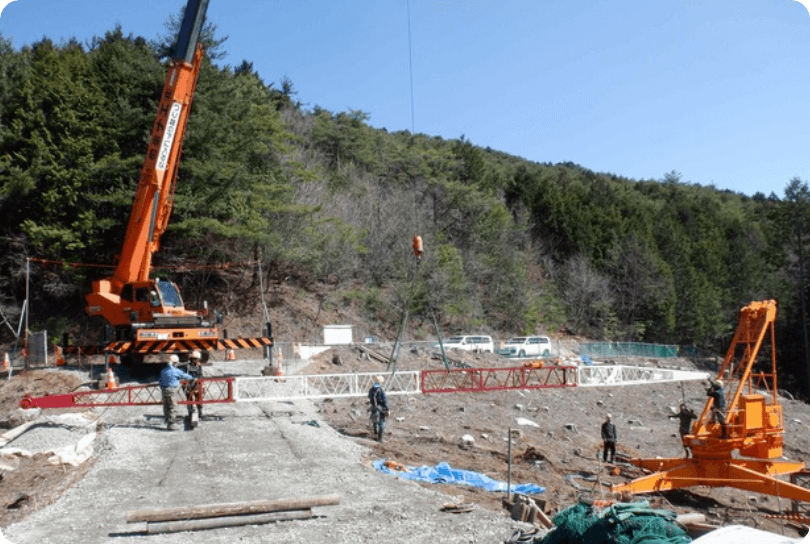 各工事を行うための前準備として敷地・作業通路の造成、整備やクレーン・重機・ステージの組立などを行います。